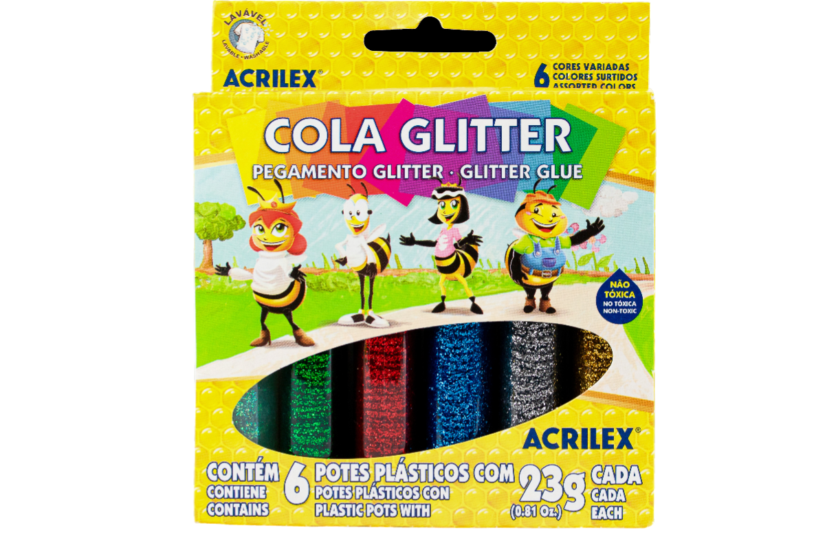 Descrição: Cola Glitter Acrilex é utilizado para colagens de papel, papel cartão e cartolina. Possui brilho intenso com glitter. Produto lavável, não mancha a roupa.