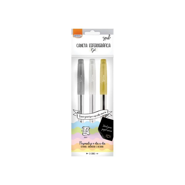 CANETA ESFEROGRÁFICA GEL 1.0MM - BRANCA, PRATA E DOURADA - BLISTER C/ 3UN BRW