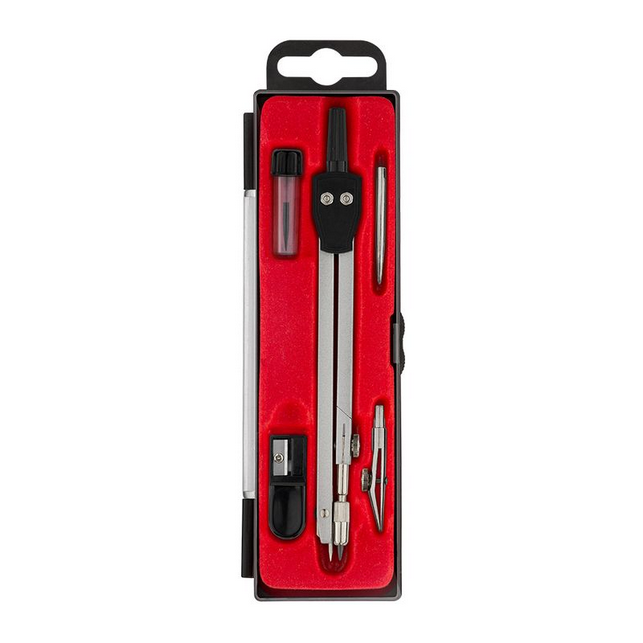 Conta com duas hastes articuladas utilizadas para traçar círculos perfeitos. O corpo de metal tem alta durabilidade e resistência. Caixa acrílica para segurança e conservação do material. Agulha de segurança e regulagem de abertura do grafite.