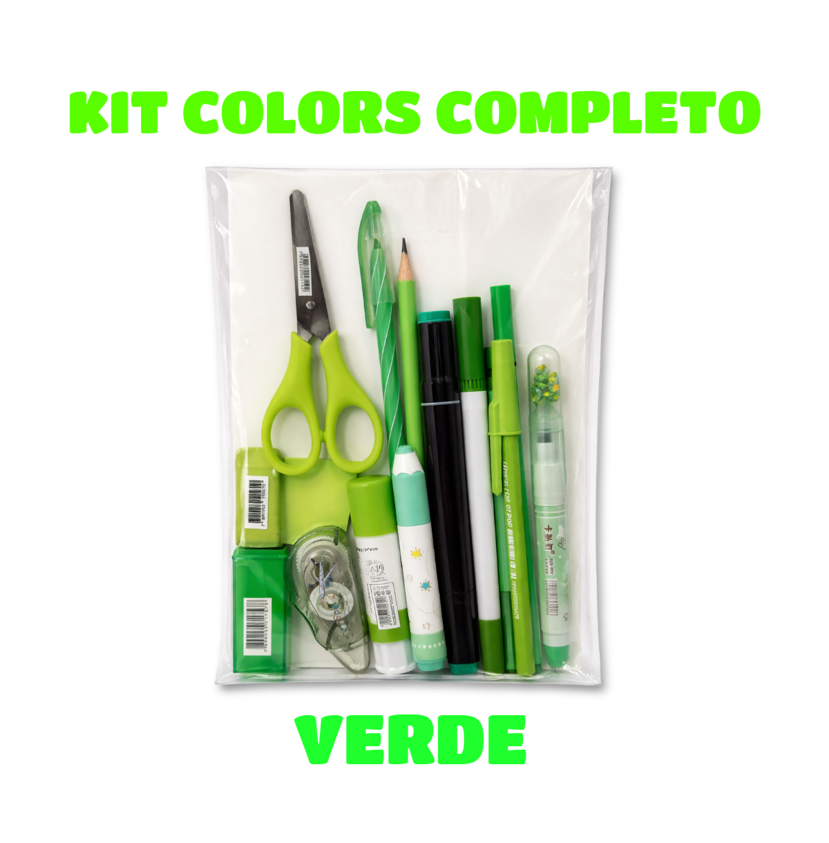 Aviso Importante: Imagem meramente ilustrativa. Os modelos, marcas e o design específico dos itens (como estampas das canetas, variações de tons de verde e formato da tesoura) podem variar conforme a disponibilidade de estoque, mantendo sempre a cor predominante e a funcionalidade de cada produto descrito.