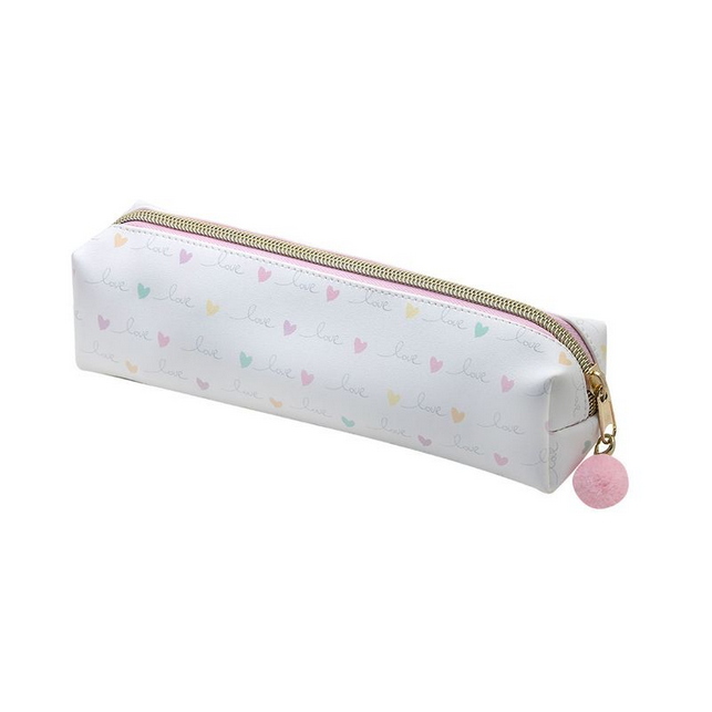 Estojo de compartimento único com pompom decorativo. Confeccionado em couro sintético, embalagem em PVC e com estampa de corações coloridos. Resistente, duradouro e lavável. Ideal para organizar materiais.