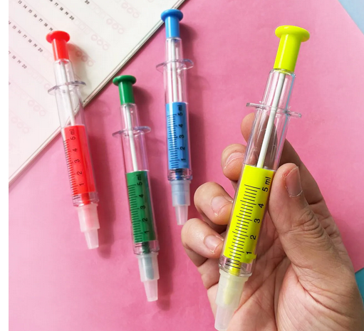 Marcador de Texto em formato de seringa, esferográfica e marca texto. Possui medidor imitando uma seringa e tampa protetora nas duas pontas.