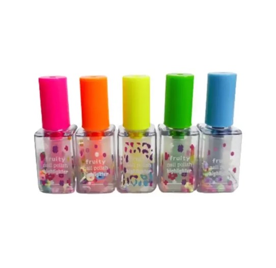Os marca textos mais fofos em formato de esmalte. Cores fluorescente que destacam as suas anotações! - Ponta chanfrada, sendo duas opções de traços, fino e grosso - Marca texto super macio - Contém 5 cores: azul, verde, rosa, laranja e amarelo
