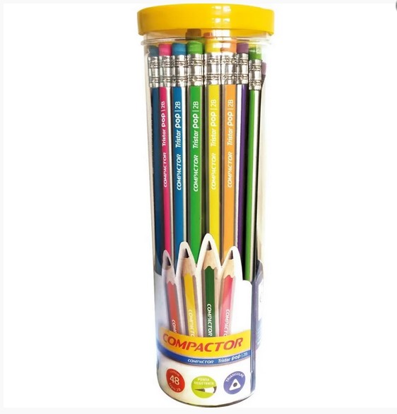 Eles são ideais para o seu dia a dia. Sua ponta HB nº2 macia, proporciona um traço mais suave e durável. Seu corpo é triangular e a borracha é colorida, nas cores verde, amarelo, rosa, laranja, violeta e azul .